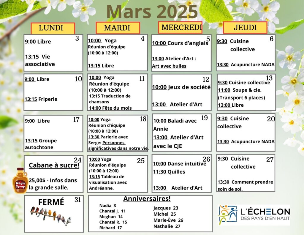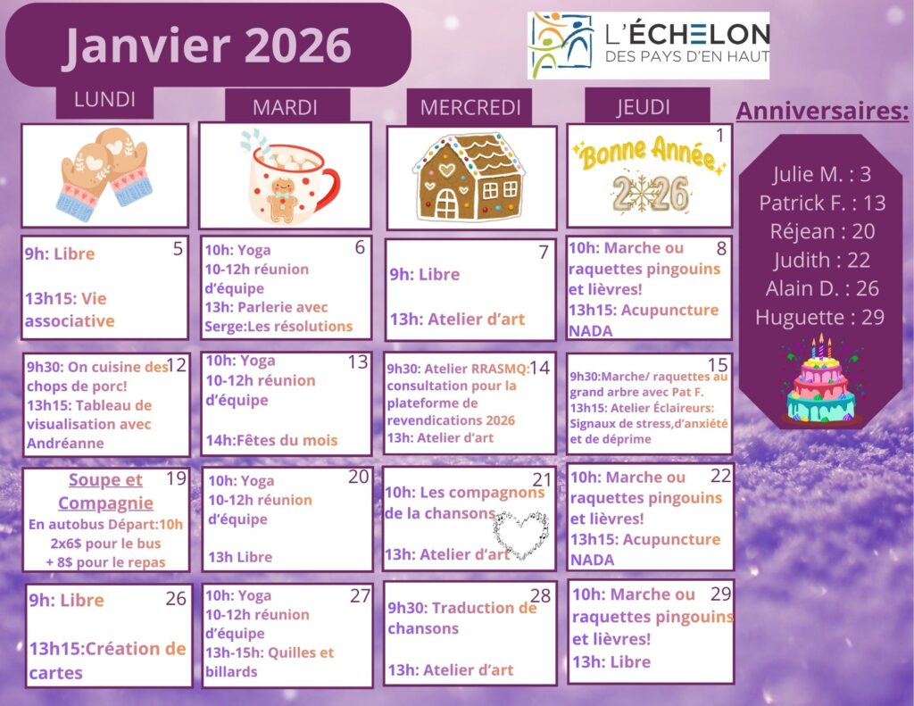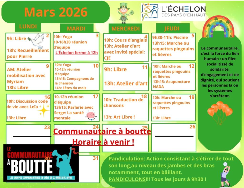 Les activités sont décidées à chaque mois à la rencontre de vie associative. Les participants peuvent proposer et voter pour les activités qu’ils aimeraient voir à l’horaire.