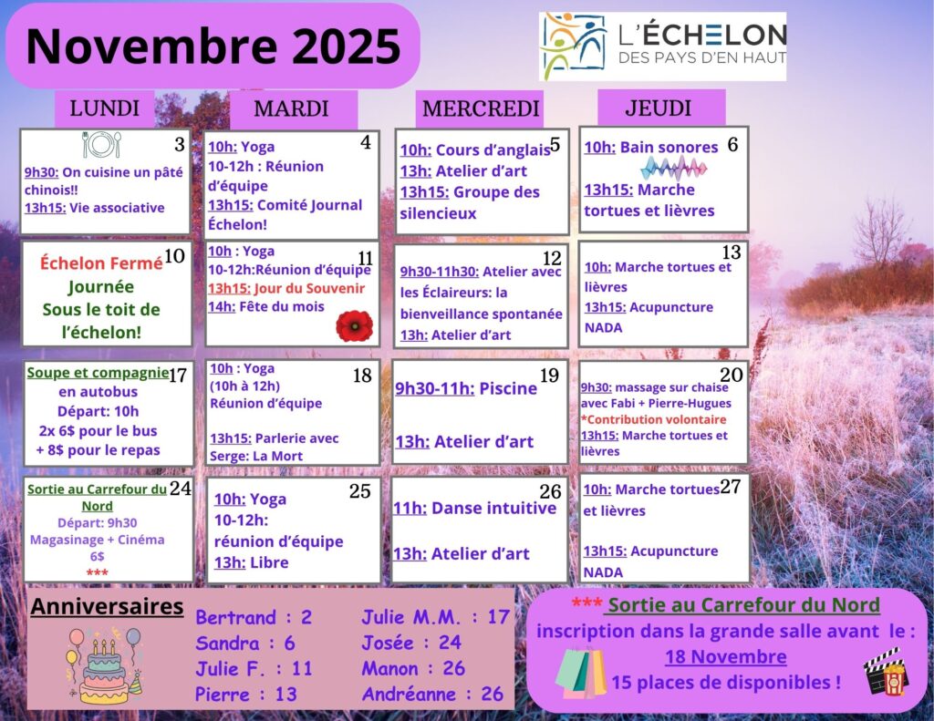 Les activités sont décidées à chaque mois à la rencontre de vie associative. Les participants peuvent proposer et voter pour les activités qu’ils aimeraient voir à l’horaire.